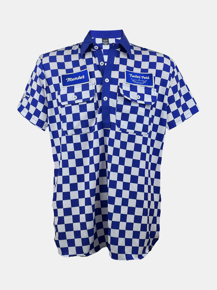 Inspired by the classic, blue-collar work shirt, this lightweight four-button polo features Trailer Park Golf Club and Member patches, TPGC embroidery on the right sleeve and our swinging flamingo embroidery on the left.